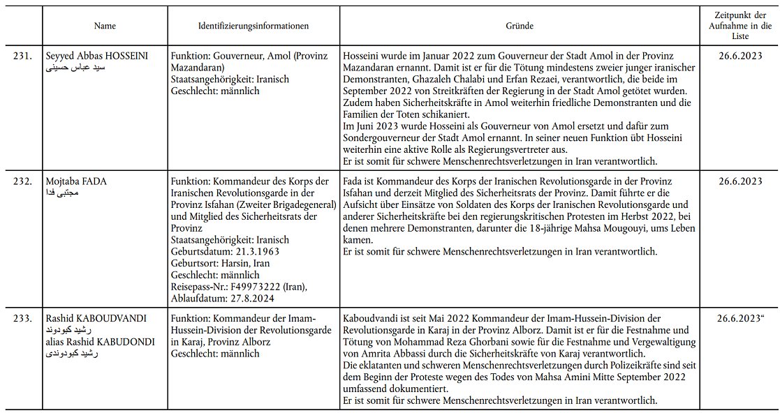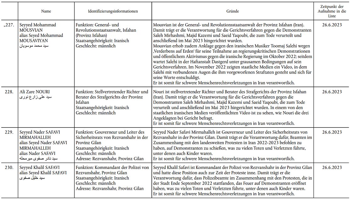 (3) Vor diesem Hintergrund und im Einklang mit der in den Schlussfolgerungen des Rates vom 12. Dezember 2022 bestätigten Zusage der Union, alle wichtigen Fragen, einschließlich der Menschenrechtslage, zusammen mit Iran anzugehen, sollten sieben Personen in die in Anhang I der Verordnung (EU) Nr. 359/2011 enthaltene Liste der natürlichen und juristischen Personen, Organisationen und Einrichtungen, die restriktiven Maßnahmen unterliegen, aufgenommen werden.