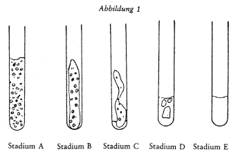 | Stadium A | (Schmelzbeginn): Feine Tröpfchen haften gleichmäßig an der Innenwand des Kapillarrohrs. |