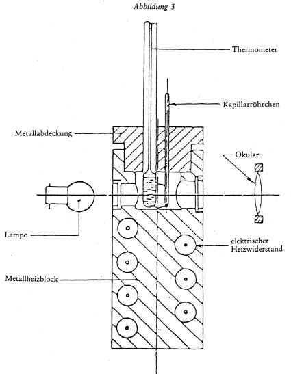 Wie in 1.4.1.1, jedoch mit dem Unterschied, daß das Kapillarröhrchen und das Thermometer in einem erwärmten Metallblock befestigt sind und sich durch Öffnungen in dem Block beobachten lassen.