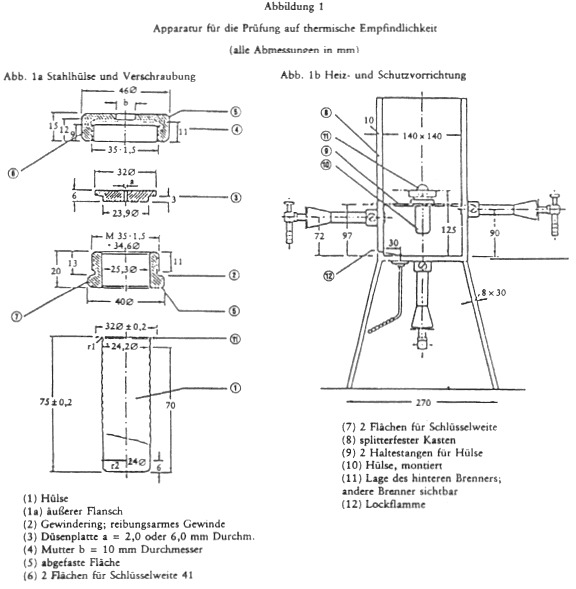 Die Apparatur besteht aus einer nicht wiederverwendbaren Stahlhülse mit deren wiederverwendbarer Verschraubung (Abbildung 1), die in eine Heiz- und Schutzvorrichtung eingesetzt wird. Jede Hülse wird aus Blech im Tiefziehverfahren hergestellt (siehe Anlage) und hat einen inneren Durchmesser von 24 mm, eine Länge von 75 mm und eine Wanddicke von 0,5 mm. Am offenen Ende sind die Hülsen mit einem Bund versehen, an dem sie mit der Düsenplatte verschlossen werden können. Der Verschluß besteht aus einer druckfesten Düsenplatte mit einer zentrischen Bohrung, die mit der aus Gewindering und Mutter bestehenden Verschraubung fest mit einer Hülse verbunden wird. Gewindering und Mutter bestehen aus Chrom-Mangan-Stahl (siehe Anlage), der bis 800 °C zunderfest ist. Die Düsenplatten sind 6 mm dick, bestehen aus warmfestem Stahl (siehe Anlage) und stehen mit verschiedenen Öffnungsdurchmessern zur Verfügung.