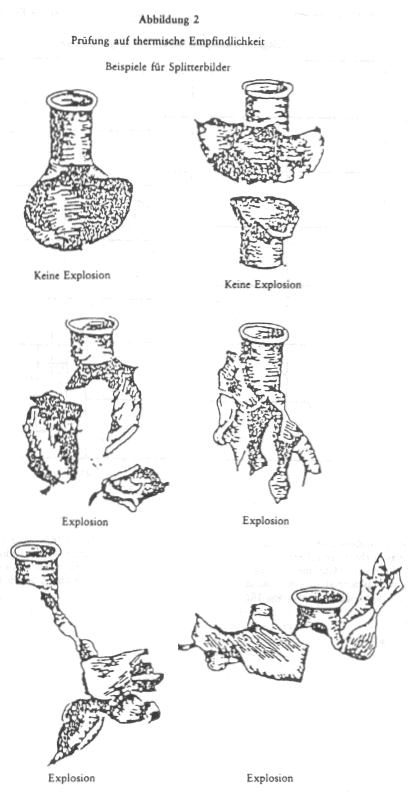 Jeder Versuch wird fortgeführt, bis die Stahlhülse entweder zerlegt oder fünf Minuten erhitzt worden ist. Ein Versuch, der zu einer Zerlegung der Hülse in drei oder mehr Teile führt (diese können in einigen Fällen noch durch schmale Metallstreifen miteinander verbunden sein - vgl. Abbildung 2), wird als Explosion eingestuft. Ein Versuch mit weniger Teilen oder überhaupt keiner Zerlegung wird nicht als Explosion eingestuft.
