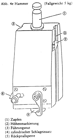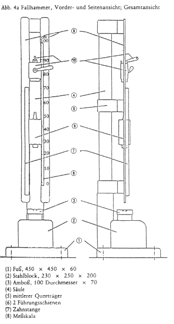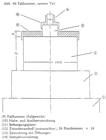 Die wesentlichen Teile eines typischen Fallhammers sind der Block aus Gußstahl mit Fuß, der Amboß, die Säule, die Führungsschienen, die Fallgewichte, die Auslösevorrichtung und ein Probenhalter. Der Stahlamboß -100 mm (Durchmesser) x 70 mm (Höhe) ist oben auf einen Stahlblock - 230 mm (Länge) ξ 250 mm (Breite) x 200 mm (Höhe) - mit Fuß - 450 mm (Länge) x 450 mm (Breite) x 60 mm (Höhe) aufgeschraubt. Eine Säule aus nahtlos gezogenem Stahlrohr ist in einer Halterung befestigt, die auf der Rückseite des Stahlblocks angeschraubt ist. Der Fallhammer ist mit vier Steinschrauben auf einem massiven Betonsockel - 60 cm x 60 cm x 60 cm - so verankert, daß die Führungsschienen absolut senkrecht stehen und das Fallgewicht leicht geführt wird. Fallgewichte zu 5 kg und 10 kg aus massivem Stahl stehen zur Verfügung. Der Schlageinsatz jedes Gewichts besteht aus gehärtetem Stahl, HRC 60 bis 63, und hat einen Mindestdurchmesser von 25 mm.