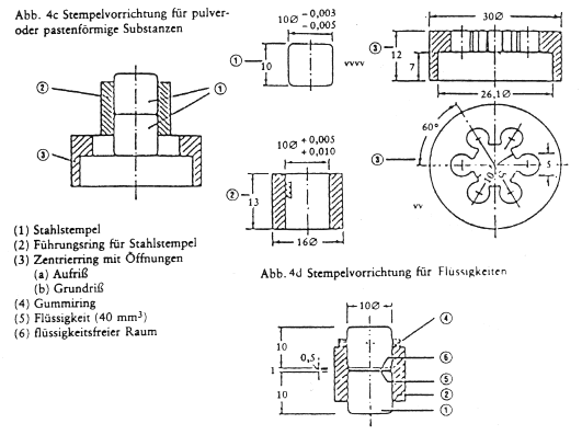 Substanzen, die in der Regel pastenförmig geliefert werden, sollten, wenn möglich, im trockenen Zustand geprüft werden, auf jeden Fall aber nach Entfernen der größtmöglichen Menge an Verdünnungsmittel. Bei der Prüfung flüssiger Substanzen ist zwischen dem oberen und dem unteren Stahlstempel ein Abstand von 1 mm zu halten.