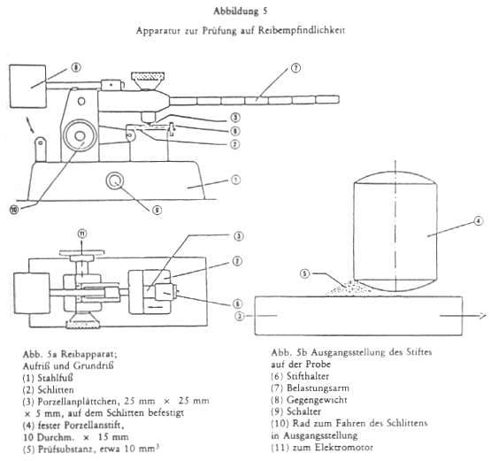 Das Prüfergebnis wird als positiv eingestuft, wenn es mit dem beschriebenen Reibapparat zumindest in einem der genannten Versuche zu einer Explosion (ein Knistern und/oder ein Knall oder eine Entflammung stehen einer Explosion gleich) kommt oder wenn bei Verwendung einer alternativen Reibprüfung die äquivalenten Kriterien erfüllt werden.