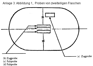| 1 Zugversuch: | Grundwerkstoff in Längsrichtung der Flasche (a); wenn dies nicht möglich ist, in Umfangsrichtung; |