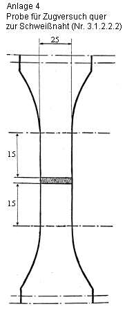3.1.2.2.2.1. Der Zugversuch quer zur Schweißnaht muß, wie in Anlage 4 dargestellt, an einer Probe vorgenommen werden, dessen Querschnitt über eine Länge von 15 mm beiderseits der Schweißnaht auf 25 mm Breite verringert ist. Von da an muß die Probenbreite gleichmäßig zunehmen.
