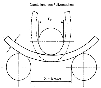 3.1.2.3.1. Der Faltversuch ist nach den Vorschriften der einschlägigen EURONORM in Übereinstimmung mit Nummer 3.1.1.1 durchzuführen. Er muß jedoch an einer 25 mm breiten Probe quer zur Schweißnaht vorgenommen werden. Dabei muß der Dorn in der Mitte der Schweißnaht liegen.