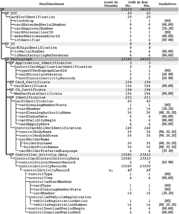 Die nutzbare Speicherkapazität von Kontrollgerätkarten beträgt mindestens 11 KB, doch sind höhere Kapazitäten zulässig. In einem derartigen Fall bleibt die Struktur der Karte gleich, während sich die Anzahl der Datensätze einiger Elemente der Struktur erhöht. Dieser Abschnitt spezifiziert die Mindest- und die Höchstwerte dieser Datensatzzahlen.