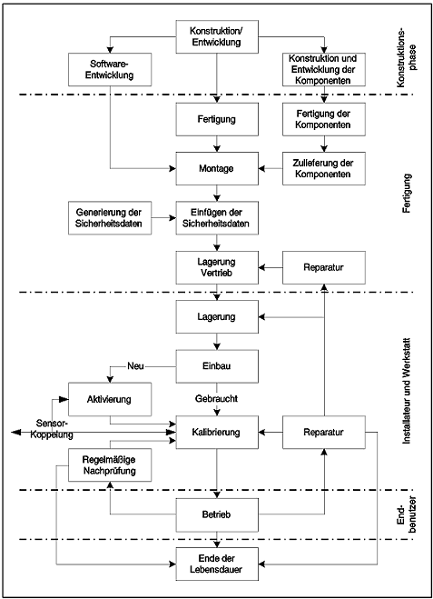 In diesem Abschnitt werden die Fahrzeugeinheit, mögliche Sicherheitsgefährdungen sowie die zu erfüllenden Sicherheitsziele beschrieben. Außerdem enthält er Erläuterungen zu den zur Durchsetzung der Sicherheitsanforderungen erforderlichen Funktionen, und es erfolgt eine Auflistung der Mindestanforderungen an die Sicherheitsmechanismen und die erforderliche Gewährleistungsebene für Entwicklung und Evaluierung.