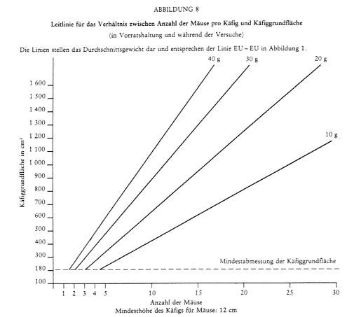 | Bild 8 Leitlinie für das Verhältnis zwischen Anzahl der Mäuse pro Käfig und Käfiggrundfläche | |
