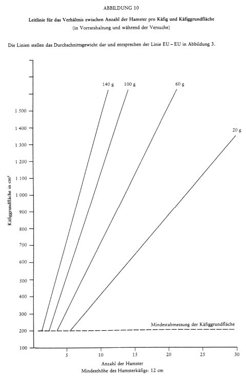 | Bild 10 Leitlinie für das Verhältnis zwischen Anzahl der Hamster pro Käfig und Käfiggrundfläche | |
