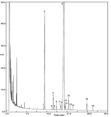 Abbildung 1 Beispiel eines Gaschromatogramms der Wachsfraktion eines Olivenöls 1