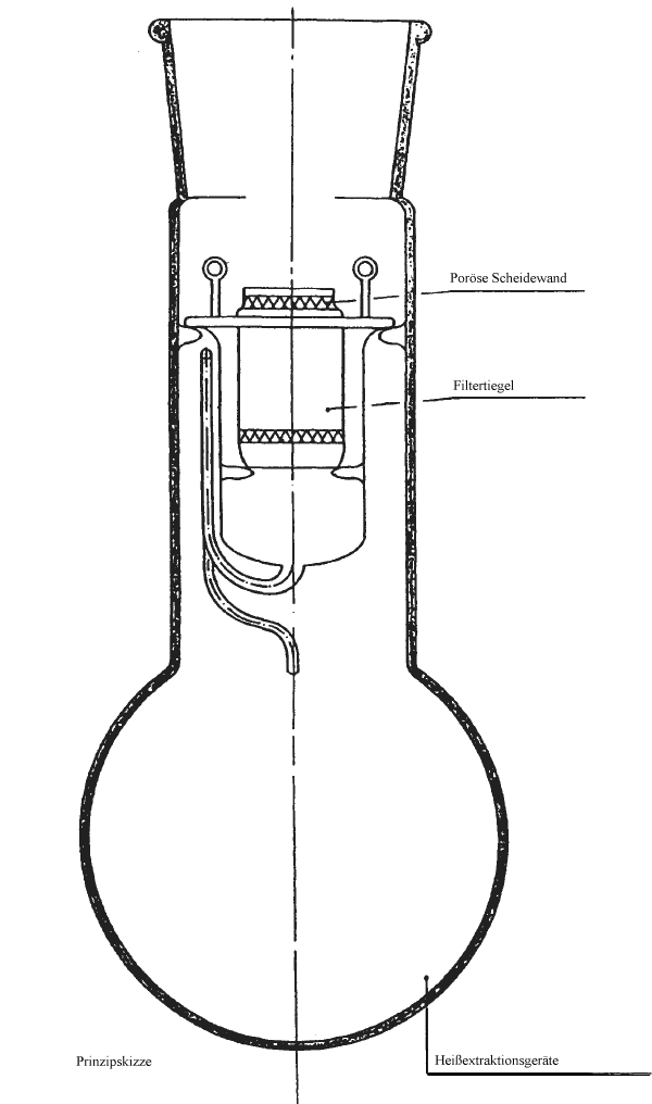 100 ml Cyclohexanon je Gramm Probe in den Destillationskolben geben, das Extraktionsgefäß ein- bzw. aufsetzen und den Filtertiegel mit der Probe einführen. Auf den Filtertiegel die leicht geneigte poröse Trennwand legen, danach den Rückflußkühler aufsetzen. Das Cyclohexanon bis zum Siedepunkt erwärmen, 60 Minuten bei einer Mindestgeschwindigkeit von etwa 12 Zyklen extrahieren. Nach Extraktion und Abkühlung den Filtertiegel aus dem Extraktionsgefäß nehmen und die poröse Scheidewand entfernen. Den Inhalt des Filtertiegels 3 bis 4 mal mit auf etwa 60 °C erwärmten 50 prozentigem Äthylalkohol und anschließend mit 1 Liter Wasser bei 60 °C waschen.