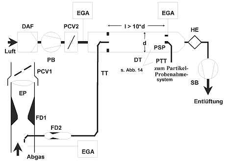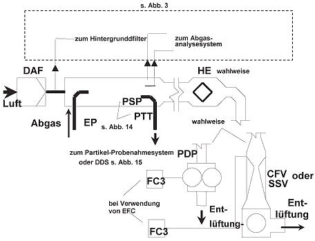 Unverdünntes Abgas wird aus dem Auspuffrohr EP durch die Probenahmesonde SP und das Übertragungsrohr TT in den Verdünnungstunnel DT geleitet. Die Abgasteilung und der Durchfluss in den DT werden mit dem Durchflussregler FC2 geregelt, der die Durchflüsse (oder Drehzahlen) des Druckgebläses PB und des Ansauggebläses SB entsprechend einstellt. Dies ist möglich, weil die mit dem Partikel-Probenahmesystem entnommene Probe in den DT zurückgeführt wird. Als Steuersignale für FC2 können GEXH, GAIR oder GFUELverwendet werden. Der Verdünnungsluftdurchsatz wird mit dem Durchflussmessgerät FM1, der Gesamtdurchsatz mit dem Durchflussmessgerät Fm2 gemessen. Das Verdünnungsverhältnis wird anhand dieser beiden Durchsätze berechnet.