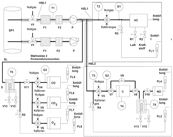 Die Probenahmeleitung dient der Entnahme von Gasproben von einer einzelnen Sonde bis hin zu dem (den) Aufteilungspunkt(en) und dem HC-Analysator.