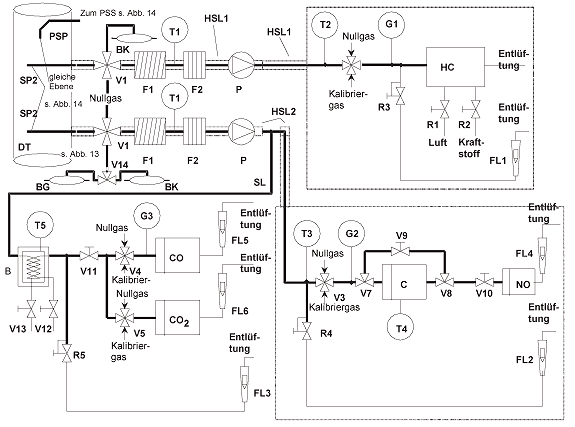 Die gasförmigen Emissionen können auch im Verdünnungstunnel eines Vollstrom-Verdünnungssystems bestimmt werden. Daher werden die Probenahmesonden für die gasförmigen Bestandteile in Abbildung 13 dargestellt, erscheinen jedoch nicht bei den Beschreibungen. Die entsprechenden Vorschriften sind in Abschnitt 1.1.1 dargelegt.