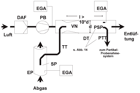 Unverdünntes Abgas wird aus dem Auspuffrohr EP durch die Probenahmesonde SP und das Übertragungsrohr TT zum Verdünnungstunnel DT geleitet, und zwar mittels eines im EP angebrachten Mengenteilers, der aus einer Reihe von Röhren mit gleichen Abmessungen besteht (Durchmesser, Länge und Biegungshalbmesser gleich). Das durch eine dieser Röhren strömende Abgas wird zum DT geleitet, das durch die übrigen Röhren strömende Abgas wird durch die Dämpfungskammer DC geleitet. Die Abgasteilung wird also durch die Gesamtzahl der Röhren bestimmt. Eine konstante Teilungsregelung setzt zwischen der DC und dem Ausgang des TT einen Differenzdruck von Null voraus, der mit dem Differenzdruckaufnehmer DPT gemessen wird. Ein Differenzdruck von Null wird erreicht, indem in den DT am Ausgang des TT Frischluft eingespritzt wird. Die Konzentrationen des Tracergases (CO2 oder NOx) werden im unverdünnten Abgas, im verdünnten Abgas und in der Verdünnungsluft mit dem (den) Abgasanalysator(en) EGa gemessen. Sie werden zur Überprüfung der Abgasteilung benötigt und können zur Einstellung von PCV1 und PCV2 im Interesse einer präzisen Teilungsregelung verwendet werden. Das Verdünnungsverhältnis wird anhand der Tracergaskonzentrationen berechnet.
