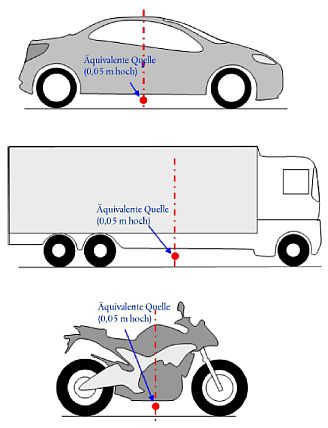 Abbildung [2.2.a] Position der äquivalenten Punktquelle bei leichten Fahrzeugen (Klasse 1), schweren Fahrzeugen (Klassen 2 und 3) und zweirädrigen Kraftfahrzeugen (Klasse 4)