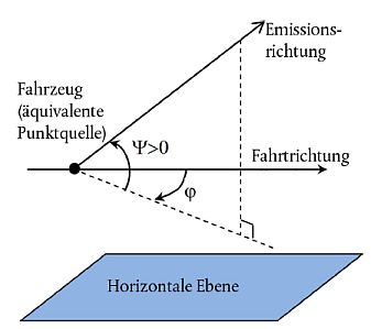 Da die Schallleistung der Quelle im "akustischen Halbraum" definiert wird, umfasst die Schallleistung auch den Effekt der Reflexion am Boden direkt unter der modellierten Quelle, wo es, abgesehen von der Reflexion an der Straßenoberfläche, die sich nicht direkt unter der modellierten Quelle befindet, keine störenden Gegenstände im unmittelbaren Umfeld gibt.