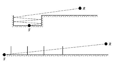 In dieser Darstellung erreicht der Schallstrahl den Empfänger, indem er die Stützwände des Einschnitts "nacheinander durchläuft", die daher mit Öffnungen verglichen werden können.