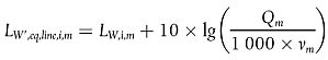Wird ein stetiger Verkehrsfluss von Qm Fahrzeugen der Klasse m je Stunde mit einer Durchschnittsgeschwindigkeit νm (in km/h) angenommen, so wird die gerichtete Schallleistung je Meter im Frequenzband i der Linienquelle LW', eq,line,i,m bestimmt durch: