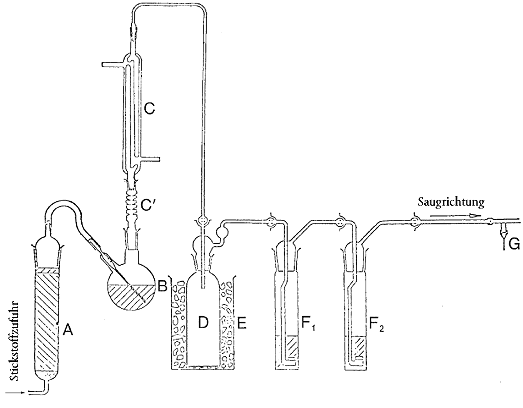 B = Reaktionskolben c = Vigreus-Fraktionierungsaufsatz, Länge 150 mm C = Kühler mit doppelter Oberfläche, Länge 200 mm D = Drechselflasche 250 ml F = Eisbad F1 und F2= Absorber Durchmesser 32-33 mm, mit kugelförmigen Glasschliffstopfen G = Saugkraftregler |