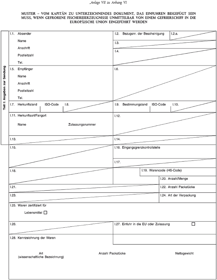 | Muster - Vom Kapitän zu unterzeichnendes Dokument, das Einfuhren beigefügt sein muss, wenn gefrorene Fischereierzeugnisse unmittelbar von einem Gefrierschiff in die Europäische Union eingeführt werden | Anlage VII zu Anhang VI |
