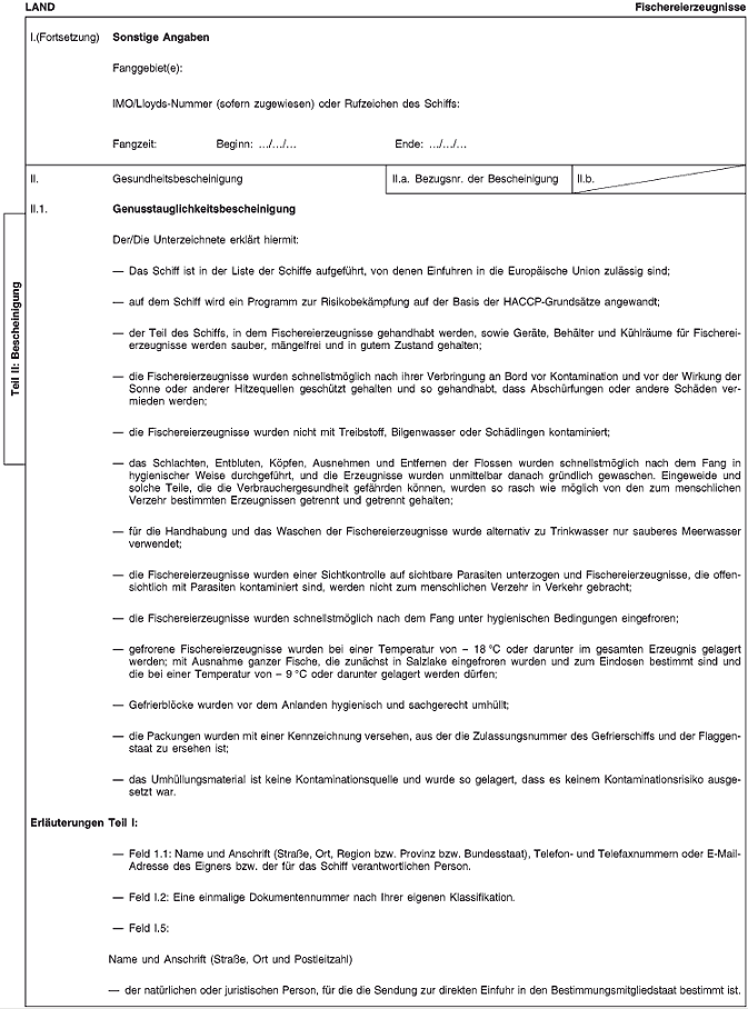 | Mustergenusstauglichkeitsbescheinigung für die Einfuhr von Fischereierzeugnissen für den menschlichen Verzehr | Anlage IV zu Anhang VI12 |