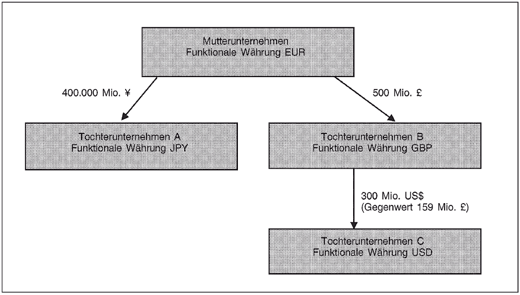64) Die direkte Methode ist die Konsolidierungsmethode, durch welche der Abschluss des ausländischen Geschäftsbetriebs direkt in die funktionale Währung des obersten Mutterunternehmens umgerechnet wird. Die schrittweise Methode ist die Konsolidierungsmethode, durch welche der Abschluss des ausländischen Geschäftsbetriebs zuerst in die funktionale Währung irgendeines zwischengeschalteten Mutterunternehmens und dann in die funktionale Währung des obersten Mutterunternehmens (oder die Darstellungswährung, sofern diese unterschiedlich ist) umgerechnet wird.