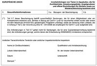 (2) Sendungen mit Tieren in Aquakultur, die für Zuchtbetriebe, Umsetzungsgebiete, Angelgewässer und offene Einrichtungen für Ziertiere sowie zur Wiederaufstockung bestimmt sind, müssen von einer Tiergesundheitsbescheinigung begleitet sein, die entsprechend dem Muster in Anhang II Teil A und den Erläuterungen in Anhang V ausgefüllt ist, wenn
