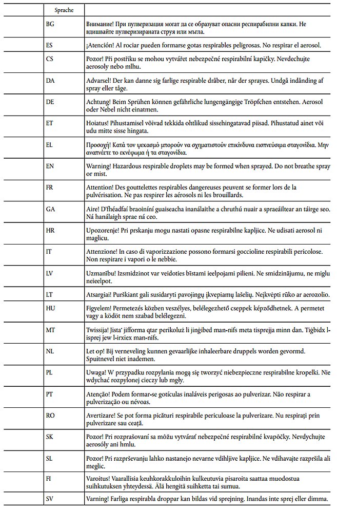 | EUH 401 | Zur Vermeidung von Risiken für Mensch und Umwelt die Gebrauchsanleitung einhalten. |
