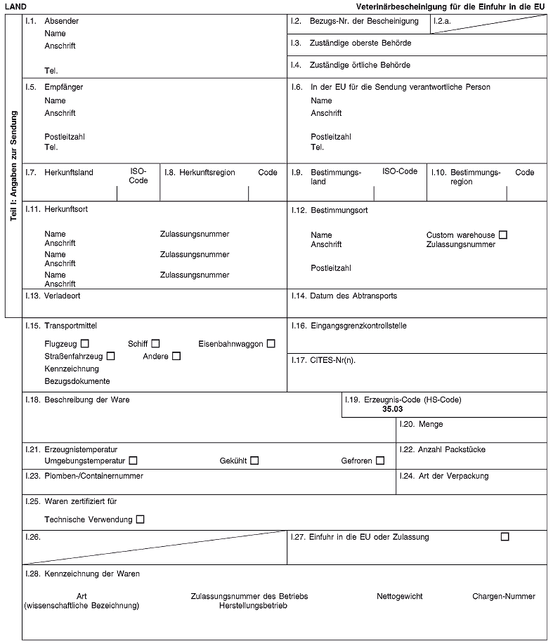 Die Unternehmer informieren unter Verwendung des folgenden Formats in TRACES die zuständige Behörde des Ursprungsmitgliedstaats und beantragen bei der zuständigen Behörde des Bestimmungsmitgliedstaats die Genehmigung des Versands von tierischen Nebenprodukten und von ihren Folgeprodukten gemäß Artikel 48 Absatz 1 der Verordnung (EG) Nr. 1069/2009 sowie von zur Entgiftung bestimmtem Fischöl oder Fischmehl aus Material der Kategorie 3: