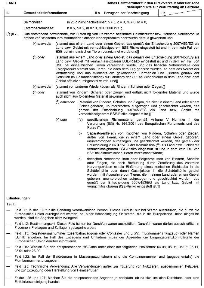 3. Abweichend von Abschnitt C Nummer 2 kann die zuständige Behörde vorschreiben, dass Sendungen mit behandelten Häuten und Fellen gemäß Nummer 2 Buchstaben c und d ein Handelspapier beiliegen muss, das dem Muster in Anhang VIII Kapitel III Nummer 6 entspricht, wenn diese an Betriebe bzw. Anlagen geliefert werden, die Heimtierfutter, organische Düngemittel oder Bodenverbesserungsmittel herstellen oder solches Material in Biogas umwandeln.