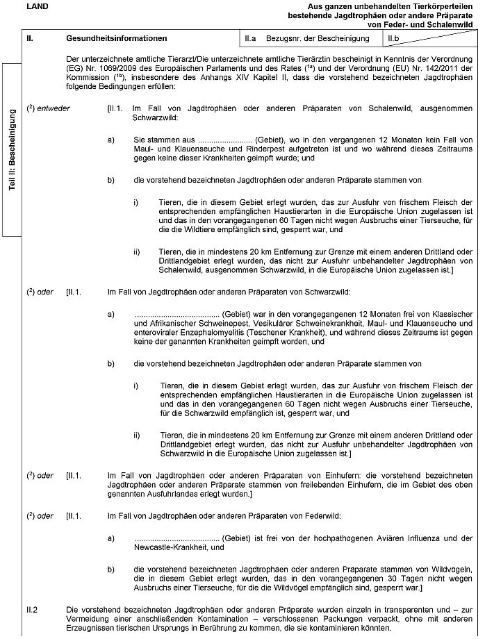 2. Andere als die in Abschnitt B und Abschnitt C Nummer 1 genannten Jagdtrophäen und anderen Präparate, die von Tieren aus einem Gebiet stammen, das wegen Ausbruchs schwerer übertragbarer Krankheiten, für die Tiere der betreffenden Arten empfänglich sind, Beschränkungen unterliegt, dürfen unter folgenden Bedingungen in Verkehr gebracht werden: