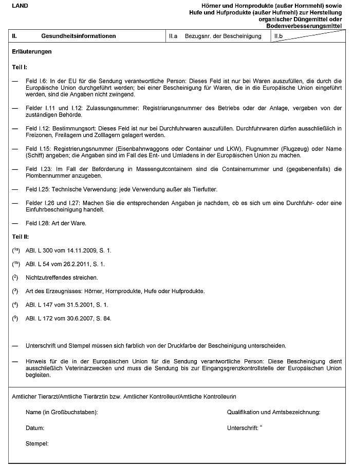 für die Einfuhr in oder die Durchfuhr durch 2 die Europäische Union von Hörnern und Hornprodukten (außer Hornmehl) sowie Hufen und Hufprodukten (außer Hufmehl), die zur Herstellung organischer Düngemittel oder Bodenverbesserungsmittel bestimmt sind