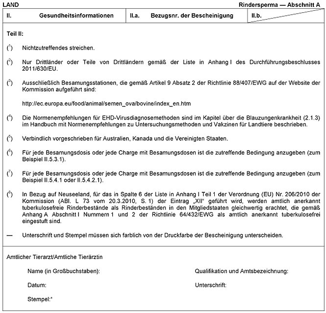 **) Die Musterbescheinigungen für Einfuhren aus der Schweiz finden sich im Anhang D der Richtlinie 88/407/EWG des Rates, mit den entsprechenden Änderungen gemäß Anhang 11 Anlage 2 Kapitel VII Abschnitt B Nummer 4 des Abkommens zwischen der Europäischen Gemeinschaft und der Schweizerischen Eidgenossenschaft über den Handel mit landwirtschaftlichen Erzeugnissen, das durch den Beschluss 2002/309/EG , Euratom des Rates und - bezüglich des Abkommens über die wissenschaftliche und technische Zusammenarbeit - der Kommission vom 4. April 2002 über den Abschluss von sieben Abkommen mit der Schweizerischen Eidgenossenschaft genehmigt wurde. ***) Für die Zwecke der Einfuhr von Rindersperma in die Union gilt, dass der Rindertuberkulosestatus eines entsprechend der neuseeländischen Seuchenbekämpfungsstrategie bezüglich der Rindertuberkulose als "C2" eingestuften Rinderbestands dem Rindertuberkulosestatus eines Rinderbestands gleichwertig ist, der in einem Mitgliedstaat gemäß Anhang a Abschnitt I Nummern 1 und 2 der Richtlinie 64/432/EWG als ,amtlich anerkannt tuberkulosefreier Rinderbestand" eingestuft ist. |