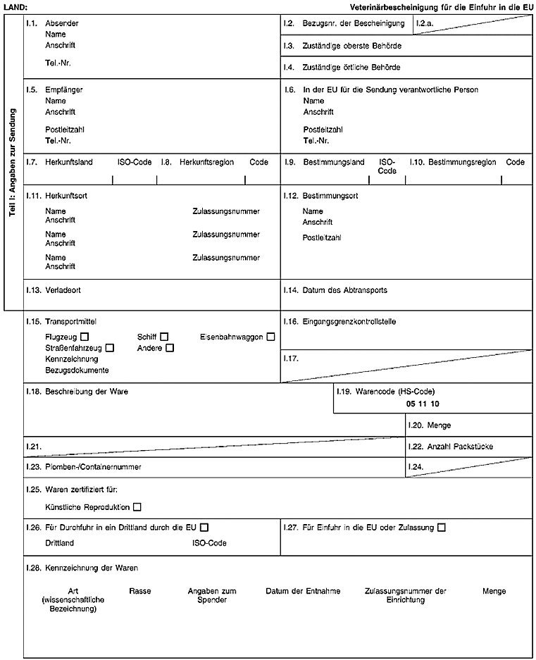| *) Die Musterbescheinigung für Einfuhren aus Kanada findet sich in der Entscheidung 2005/290/EG der Kommission vom 4. April 2005 über vereinfachte Veterinärbescheinigungen für die Einfuhr von Rindersperma und frischem Schweinefleisch aus Kanada sowie zur Änderung der Entscheidung 2004/639/EG (nur für in Kanada entnommenes Sperma) und entspricht dem Abkommen zwischen der Europäischen Gemeinschaft und der Regierung Kanadas über gesundheitspolizeiliche Maßnahmen zum Schutz der Gesundheit von Mensch und Tier im Handel mit lebenden Tieren und Tierprodukten, das durch den Beschluss 1999/201/EG des Rates genehmigt wurde.