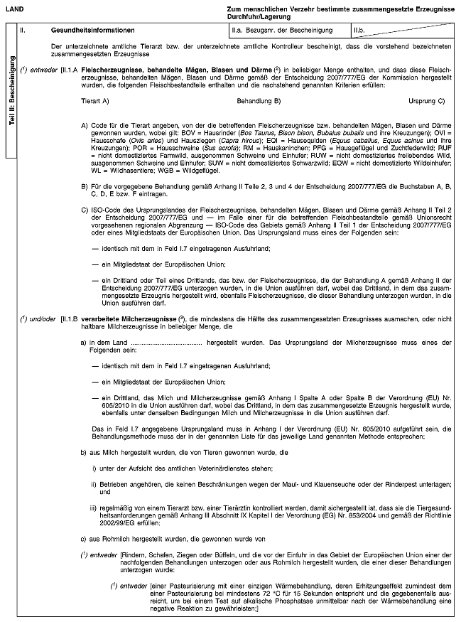 | Muster-Veterinärbescheinigung für die Durchfuhr durch die Europäische Union oder die Lagerung in der Europäischen Union von zum menschlichen Verzehr bestimmten zusammengesetzten Erzeugnissen | Anhang II12 |