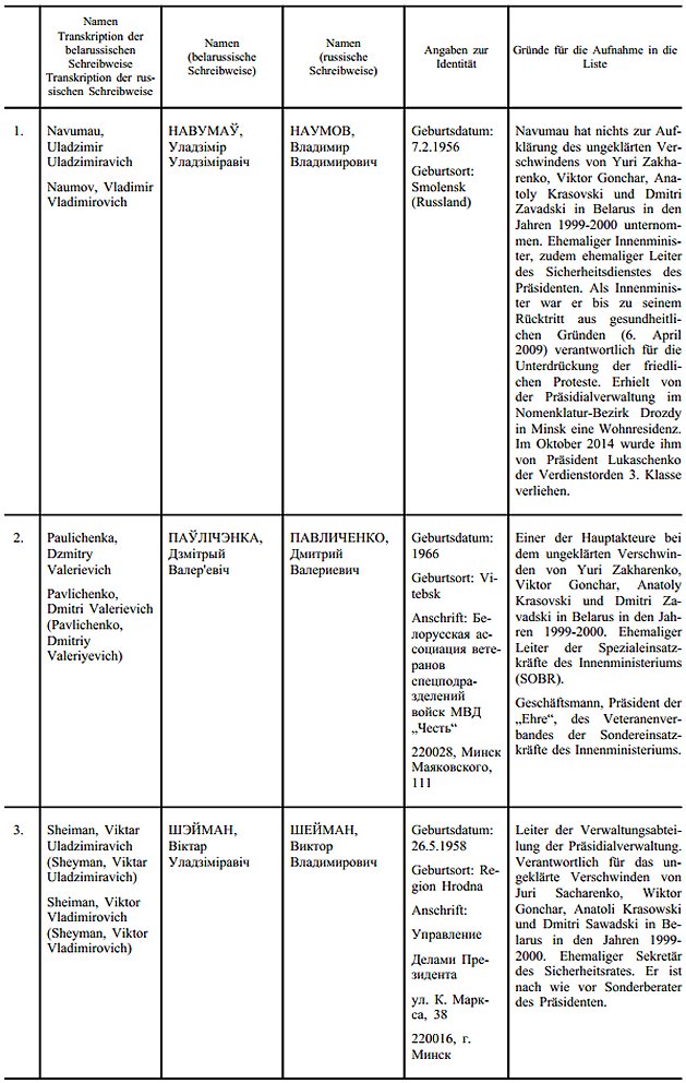 (3) Aufgrund spezifischer Bedenken sind restriktive Maßnahmen gegen Personen verhängt worden, die dem Pourgourides-Bericht zufolge eine maßgebliche Rolle bei dem ungeklärten Verschwinden von vier namhaften Persönlichkeiten in Belarus in den Jahren 1999 und 2000 und der anschließenden Verschleierungsaktion gespielt haben, sowie gegen Personen, die es unterlassen haben, in der Sache unabhängige Ermittlungen oder eine strafrechtliche Verfolgung einzuleiten.