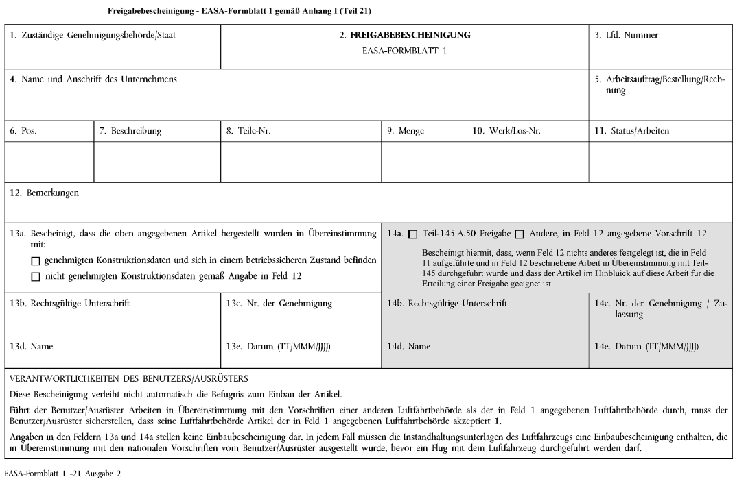 Gegenstand einer Freigabebescheinigung (EASA-Formblatt 1) ist, die bescheinigt, dass es in Übereinstimmung mit den genehmigten Konstruktionsdaten hergestellt wurde, und gemäß Abschnitt Q gekennzeichnet ist oder