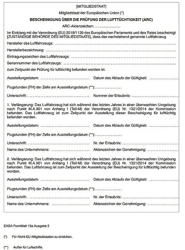 Bemerkungen. Alle Erklärungen, Informationen, besonderen Daten oder Beschränkungen, die Auswirkungen auf die Lufttüchtigkeit des Luftfahrzeugs haben können. Falls keine derartigen Informationen oder Daten vorliegen, ist "Keine" einzutragen.