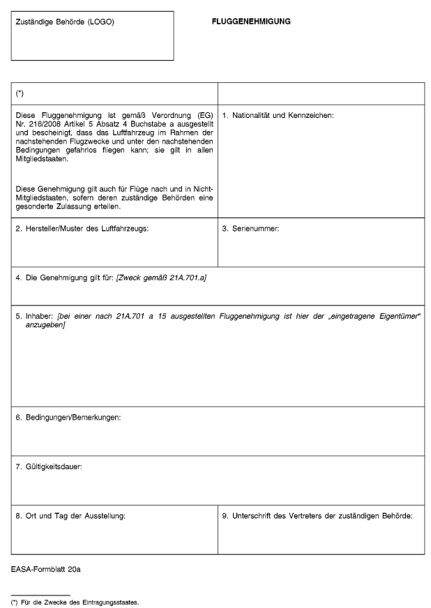 1.2 Zweck der Konformitätserklärung für ein Luftfahrzeug (EASA-Formblatt 52), das unter dem vorliegenden Anhang (Teil 21) Hauptabschnitt a Abschnitt G ausgestellt wird, ist es, dem Inhaber einer entsprechenden Genehmigung als Herstellungsbetrieb die Ausübung des Vorrechts zu ermöglichen, ein Lufttüchtigkeitszeugnis für ein einzelnes Luftfahrzeug von der zuständigen Behörde des Eintragungsmitgliedstaats zu erhalten.