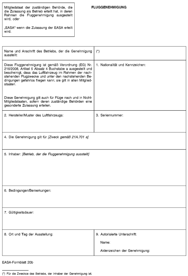 Voraussetzung für die Gültigkeit der Konformitätserklärung ist, dass alle Felder des Formblatts vollständig ausgefüllt sind. Eine Ausfertigung des Testflugberichts zusammen mit Mängelberichten und Angaben zur Behebung sind von dem Inhaber der Genehmigung als Herstellungsbetrieb aufzubewahren. Der Bericht ist als befriedigend von dem entsprechenden freigabeberechtigten Personal und einem Mitglied der Flugbesatzung, z.B. Testpilot oder Testflugingenieur, zu unterzeichnen. Die durchzuführenden Testflüge sind die unter Kontrolle des Qualitätssystems festgelegten Flüge, wie es durch Nummer 21.A.139, insbesondere Nummer 21.A.139 Buchstabe b Ziffer 1 vi festgelegt ist, um sicherzustellen, dass das Luftfahrzeug den anwendbaren Konstruktionsdaten entspricht und in einem betriebssicheren Zustand ist.