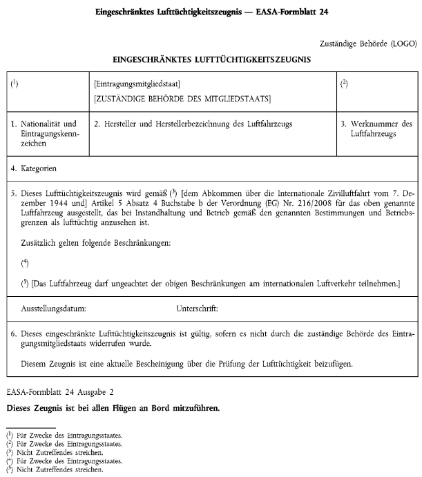 Dieses eingeschränkte Lufttüchtigkeitszeugnis wird auf der Grundlage einer Compliance-Erklärung für die Konstruktion ausgestellt, die nach der Verordnung (EU) Nr. 748/2012 abgegeben wird, und ist in allen EU-Mitgliedstaaten ohne weitere Anforderungen oder Bewertungen gültig und anerkannt. Dieses Zeugnis entspricht nicht allen anwendbaren Standards von Anhang 8 des Abkommens über die Internationale Zivilluftfahrt und ist möglicherweise nicht gültig für den internationalen Luftverkehr über Nicht-EU-Mitgliedstaaten, sofern nicht von den überflogenen Staaten genehmigt.