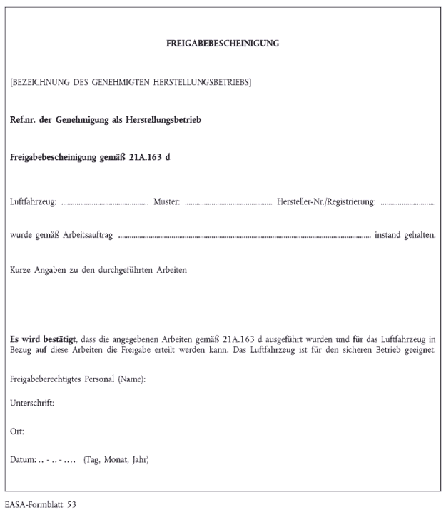 Der Einbau eines Bau- oder Ausrüstungsteils in ein musterzertifiziertes Produkt ist zulässig, wenn sich das Teil in einem betriebssicheren Zustand befindet, nach Abschnitt Q gekennzeichnet ist und ihm eine Freigabebescheinigung ( EASA-Formblatt 1) beigefügt ist, aus der hervorgeht, dass die Herstellung in Übereinstimmung mit genehmigten Konstruktionsdaten erfolgte.