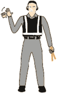 Arm und Einwinkstab werden vor dem Körper in Schulterhöhe ausgestreckt; Hand und Einwinkstab werden zum oberen Teil der linken Schulter bewegt und mit einer schneidenden Bewegung des Einwinkstabes vor der Kehle zum oberen Teil der rechten Schulter geführt. |