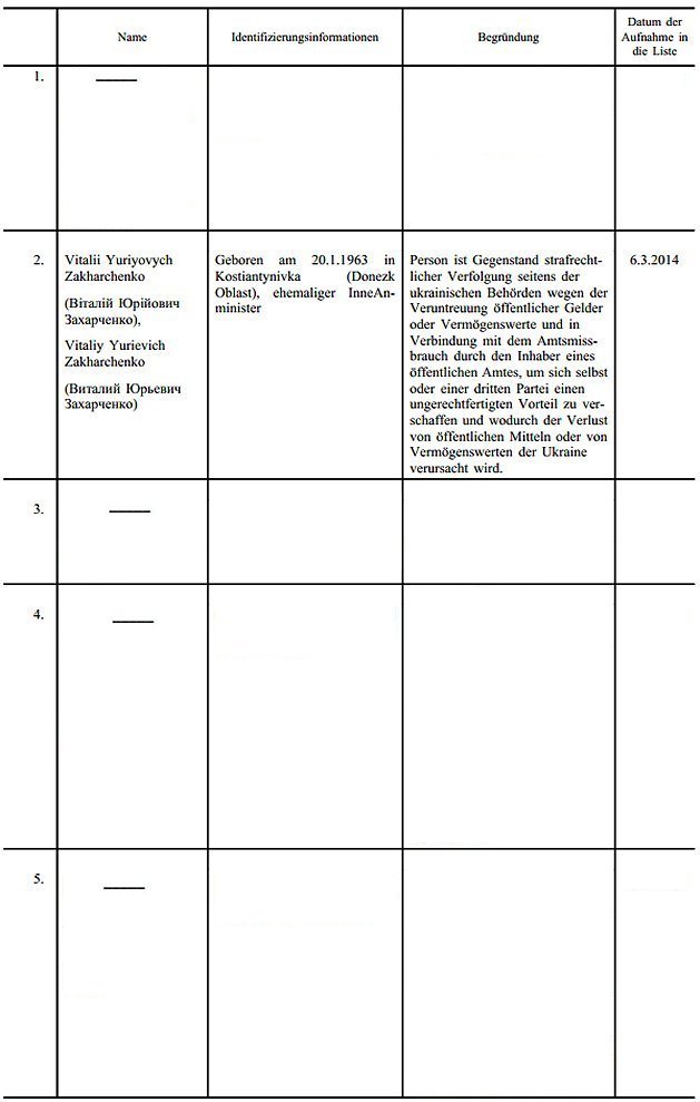 (1) Anhang I enthält eine Liste der natürlichen oder juristischen Personen, Einrichtungen und Organisationen, die vom Rat nach Artikel des Beschlusses 2014/119/GASP als für die Veruntreuung staatlicher Vermögenswerte verantwortlich ermittelt worden sind, der für Menschenrechtsverletzungen in der Ukraine verantwortlichen Personen und der natürlichen und juristischen Personen, Organisationen und Einrichtungen, die mit ihnen in Verbindung stehen.