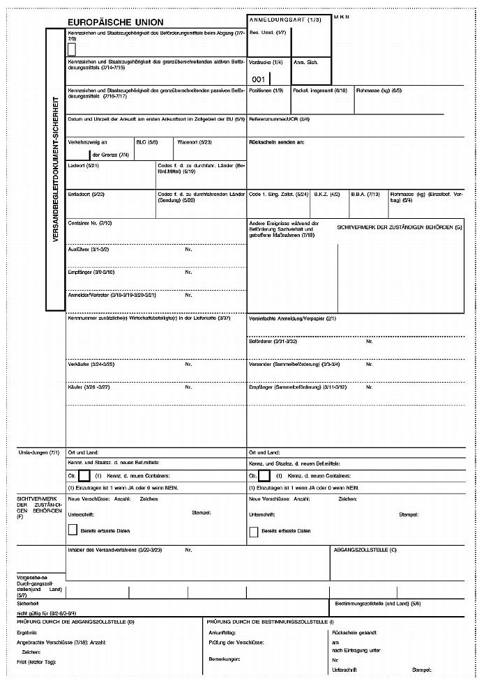 Die Angaben im Versandbegleitdokument/Sicherheit stützen sich auf Daten aus der Versandanmeldung; diese Angaben werden gegebenenfalls vom Inhaber des Versandverfahrens geändert und/oder von der Abgangszollstelle überprüft.