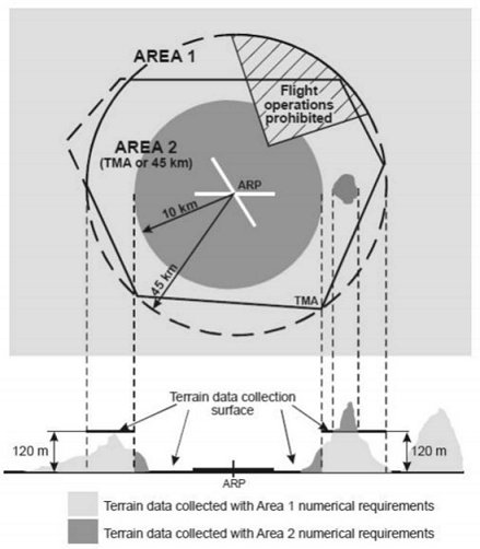 (5) Bereich 3 oder Teile desselben gemäß Punkt AIS.TR.350(c) für Gelände, das sich 0,5 m über der Horizontalebene erstreckt und durch den nächstgelegenen Punkt auf der Flugplatzbewegungsfläche verläuft, und