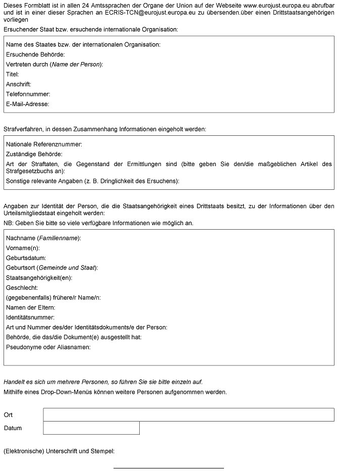 | Standardformblatt für Auskunftsersuchen gemäss Artikel 17 Absatz 1 der Verordnung (EU) 2019/816 zur Einholung von Informationen darüber, in welchem Mitgliedstaat eventuell Strafregisterinformationen über einen Drittstaatsangehörigen vorliegen | Anhang |